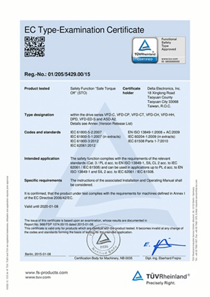 С конца 2014 года Delta Electronics добавила в преобразователи частоты серий C2000, CP2000, CH2000, VFD-ED-S, а также в сервоусилители ASDA-A2-E функцию безопасного отключения крутящего момента (STO), предусмотренную европейским стандартом EC Directive 2006/42/EC (ГОСТР МЭК 61800-2-2012). Данная функция уже сертифицирована компанией TÜV Rheinland Group: