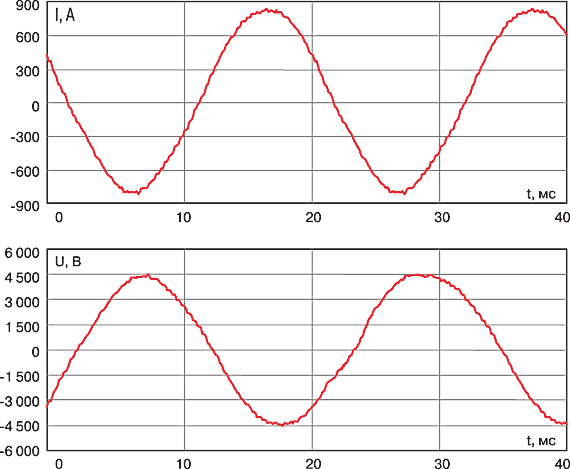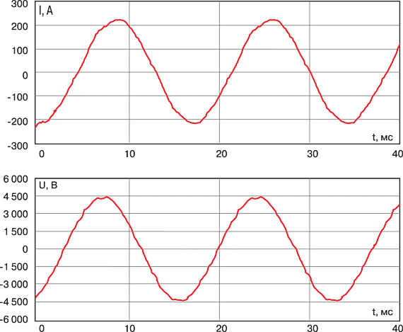 АИТ с параллельными конденсаторами имеет достаточно «гладкие» формы выходных тока и напряжения (осциллограмма на рис. 4 снята при номинальной нагрузке электропривода 1570 кВт, 3300 В).