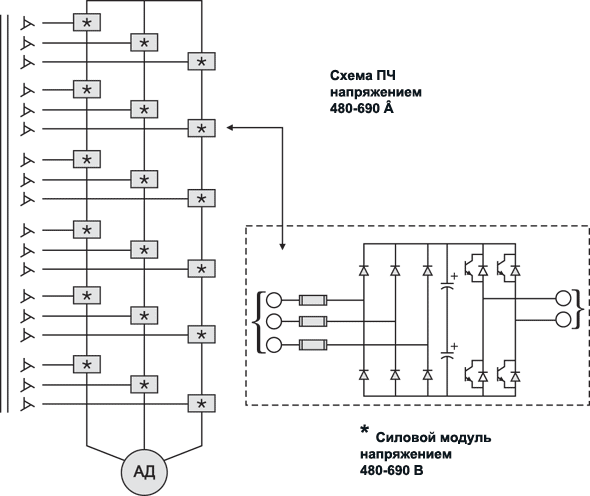 Каждая обмотка трансформатора подключена к силовому модулю – ячейке Power-Cell, состоящей, как показано на рис.11, из диодного выпрямителя и однофазного IGBT-АИН с ШИМ. В случае неисправности ячейки, благодаря функции Power-Cell-Bypass, дефектная ячейка автоматически шунтируется (выводится из работы), а управление оставшимися ячейками автоматически корректируется. Это обуславливает весьма высокую живучесть ВПЧ.