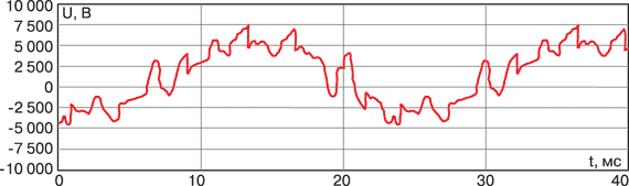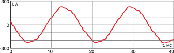 Осциллограмма на рис. 2, снятая на электроприводе ЭТВА питательного насоса ТЭС, иллюстрирует формы тока в фазе и линейного напряжения статора асинхронного двигателя при частоте порядка 32 Гц.