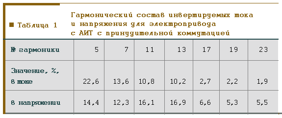 Содержание высших гармоник в токе и напряжении для этого электропривода при частоте 50 Гц показано в табл. 1.