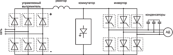Российская схема Первыми в начале 80-х годов были созданы ВПЧ, содержащие автономные инверторы тока на SCR-тиристорах. Переключение тиристоров в таких АИТ обеспечивается введением тем или иным способом дополнительной эдс в контур коммутации. В качестве источника такой эдс в этих инверторах используют конденсаторы.